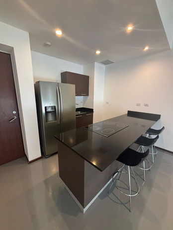 La cocina está integrada y es muy funcional. Presenta una moderna isla con plantilla de vitrocerámica y espacio para desayunador con sillas altas, sobres de granito negro y elegantes gabinetes oscuros. Se entrega equipada con un refrigerador de acero inoxidable. La habitación principal incluye aire acondicionado para su confort, y las amplias ventanas en todas las áreas garantizan abundante luz natural.
