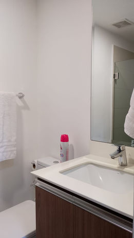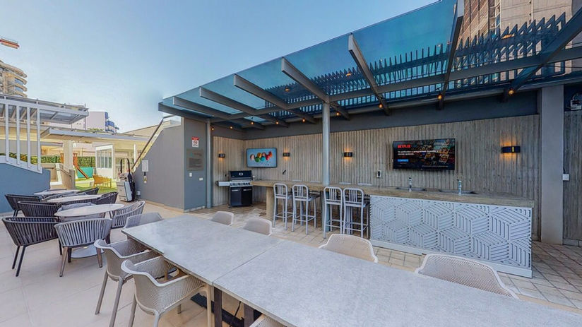 El apartamento presenta una distribución eficiente en 43 m² que privilegia la iluminación natural y el aprovechamiento del espacio. La cocina integrada facilita el estilo de vida contemporáneo: plantilla de dos discos y extractor para cocinar con comodidad, y torre de lavado que optimiza el área de servicio. La habitación principal cuenta con cortinas que garantizan privacidad y confort térmico, complementadas por el aire acondicionado central en la unidad.