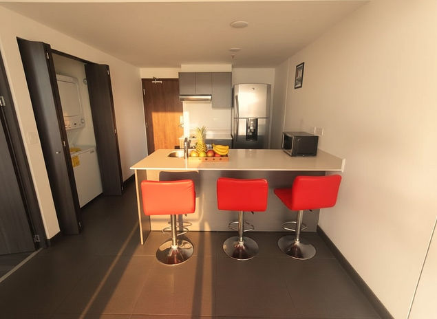 El apartamento ha sido concebido bajo un concepto contemporáneo que privilegia la luminosidad y la optimización de los espacios. La distribución tipo loft permite una transición fluida entre la sala, el comedor y la cocina, creando un ambiente práctico y elegante para la vida diaria.