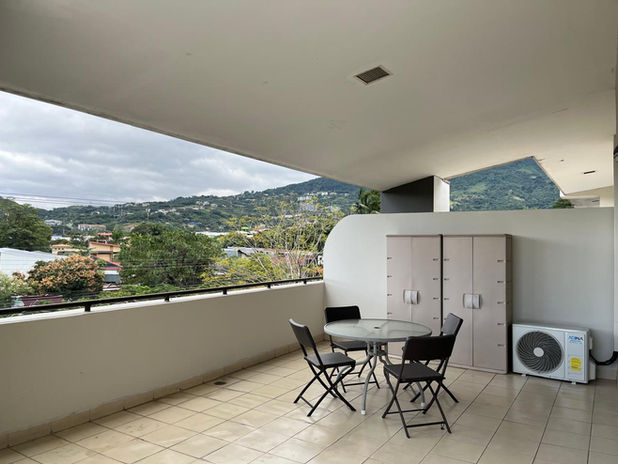 La distribución incluye una zona social integrada que se conecta con una amplia terraza privada. Como se aprecia en las imágenes, esta terraza es el rincón perfecto para disfrutar del café matutino con vistas a las copas de las palmeras y las montañas de Santa Ana.