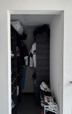 Ascendiendo por una elegante escalera con peldaños de madera y estructura metálica, se llega a la planta alta, dedicada exclusivamente al descanso. El dormitorio es un refugio luminoso con vistas panorámicas de la ciudad y las montañas a lo lejos. La cama tamaño queen, vestida con ropa de cama blanca impecable y acentos de color rojo, está flanqueada por mesitas de noche de madera y una moderna lámpara de pie. Aquí, la comodidad se une a la tecnología con aire acondicionado individual y un sistema de cortinas automatizadas que incluye opciones de "screen" para filtrar la luz y "blackout" para un descanso total, controlables con facilidad. Esta planta también cuenta con un amplio walk-in-closet, proporcionando abundante espacio de almacenamiento.